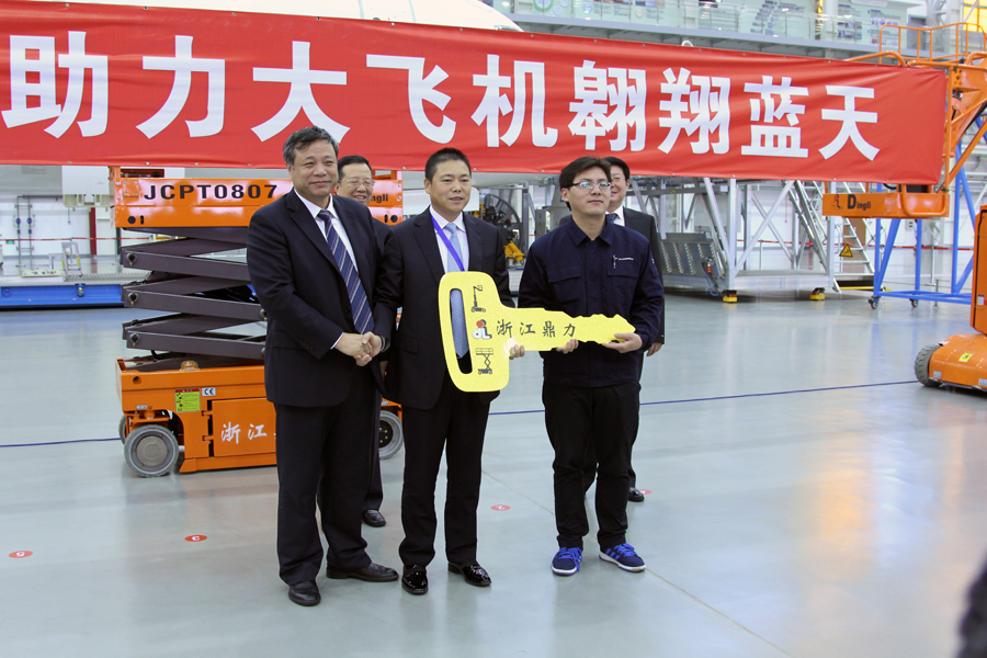 鼎力向中国商飞公司隆重交付了首批智能高空作业设备,主要用于飞机的总装制造、检修和维护等,宣告安全高效的国产智能高空作业设备正式助力国产大飞机的制造。出席本次交机仪式的嘉宾有中国商用飞机有限责任公司副总经理刘林宗、中国商用飞机有限责任公司总经理助理兼上飞公司总经理沈卫国、上飞公司党委书记肖云、上飞公司副总经理任彬、浙江