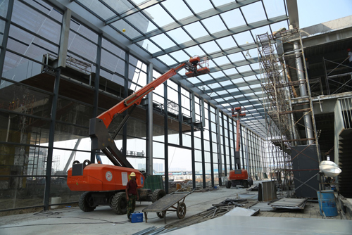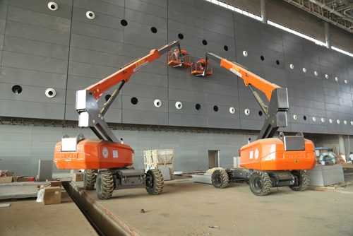 鼎力高空作业设备,其中包括工作高度28米的GTBZ28SI、24米的GTBZ24S和20米的GTBZ20SI高空作业平台,主要用于会展中心钢结构焊接,柱体喷涂,机电安装,管道管线、电路电线的铺设,内部精装修,外围配套工程施工等日常工作。