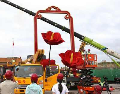 今年的花篮体量巨大:花坛顶高17米,篮体高15.3米,篮盘直径15米,花坛底部直径达50米。与以往选择牡丹等中国传统花材不同,今年为了庆祝改革开放40周年,首次选用红掌,并用许多红掌组合成一朵大花,寓意红心向党、团结凝聚在一起。摆放从9月14日深夜开始,鼎力高空作业平台也参与了此次巨型花篮的安装工作。